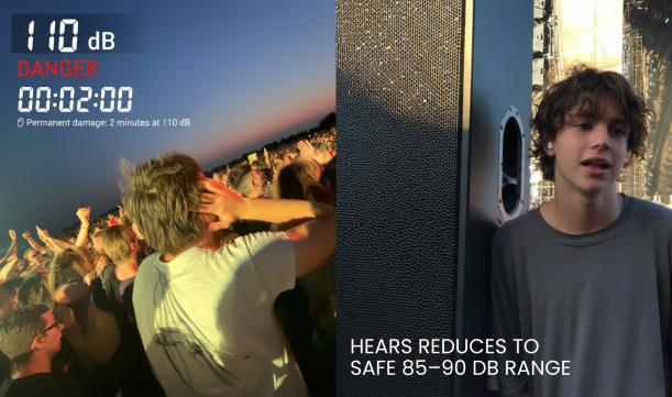 A Hears reduz esses níveis perigosos de 110+ dB para os seguros 80 e 90, estendendo dramaticamente seu tempo de exposição seguro. Isso significa que você pode apreciar concertos inteiros e dias de festival sem os danos auditivos acumulativos que vêm da exposição repetida a volumes altos.
